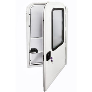 Produto robusto e de qualidade, fabricado em fibra pintura em gelcoat com acabamento interno primoroso tem seu diferencial por sua ampla vigia (janela de porta) tem seu marco fabricado em alumínio proporcionando menor peso para seu projeto.